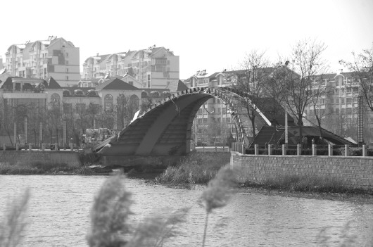 正在被拆除的彩虹湖景观桥。 本报记者 阚乐乐 摄