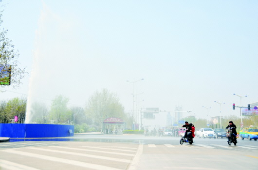15日中午12点左右,记者到达现场发现,有的行人甚至专门把车停在路边拍照。此时正值下班的高峰期,黄河五路上来往的行人和车辆正多。不时有骑车子的行人路过“水柱喷泉”时,企图加快车速通过却仍被淋湿全身,而有的车主却对这免费的水“动了心思”,故意放慢车速,想要“借水洗车”。虽然车流缓慢,但并未造成交通拥堵。
