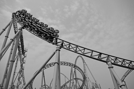 游客在欧乐堡景区内体验单体造价超亿元的“蓝火过山车”,因为游乐性质的限制,青年群体是主要客群。