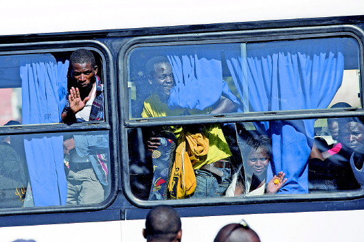 18日,在南非德班的难民安置营地,马拉维人准备乘坐大巴回国。 新华/路透