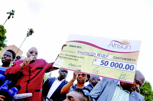 18日,在南非德班的难民安置营地,总统祖马(左二)展示他给外国侨民捐款的支票样本。 新华/法新