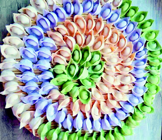 6.按自己的喜好调馅,用普通包馄饨方法包好即可;