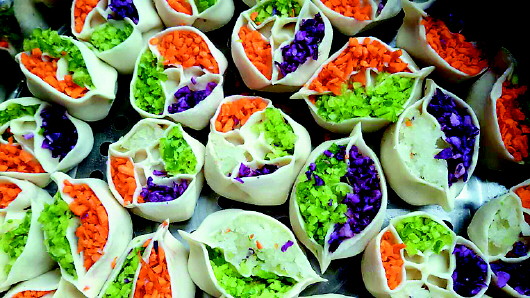 1.大头菜洗净后放入开水锅中煮熟,捞出控去水分切末,取一小部分留作“四喜”中的馅料,其余留作与猪肉馅混合;胡萝卜洗净切末;香菇泡发后切末;葱姜切末;鸡蛋打散后摊成蛋饼,然后取出切末;
