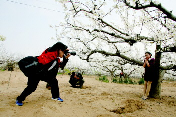 18日,在莱阳照旺庄镇西陶漳村梨园,几位摄影爱好者给一位美女留下与洁白梨花的合影。当日,莱阳梨花节启幕,万亩梨花似白雪的景象吸引了来自青岛、烟台等地的赏花客前来。同时,以西陶漳梨园为主题的“情系我梨乡,最美西陶漳”摄影大赛正式启动。 本报记者 赵金阳 摄影报道