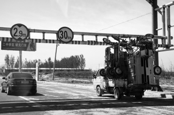 近日,在武城县龙四路上,一辆拉有三轮车的小型货车卡在限高杆下,司机师傅称卡在距离城区较远的半路上,让人有些措手不及。 本报记者 王小会 摄