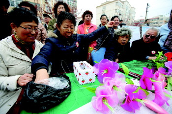 18日,宁夏路街道的居民在互相学习手工艺品制作,其乐融融。