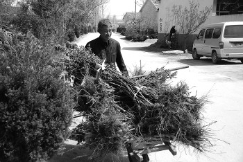 在村里,记者遇到另一位种植户尹老汉,他推着手推车,车上放着整齐捆绑好的樱花苗。当记者询问他这些树苗打算用来做什么时,尹老汉说,有人要就卖,没人要就当柴火烧。