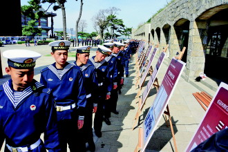 4月17日是丧权辱国的《马关条约》签订120周年。当天,在刘公岛,主题“铭记国耻、以史为鉴”的图片展和签名活动举行。