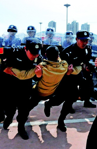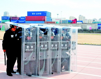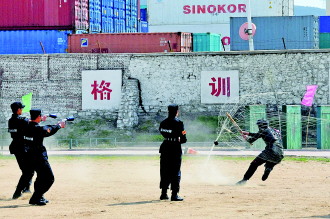第二个演练科目是,一情绪失控的男子在市场上持刀叫骂,6名执勤队员组成战术突击小组,用防爆盾牌、抓捕器和应急棍应对嫌疑人的刀砍,呈三角形逐步推进、包围。辅警队员还使用网枪,用织网控制住歹徒。