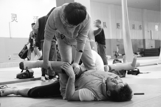 21日上午,柔道选手在训练馆内做热身。 本报记者 王晓霜 摄