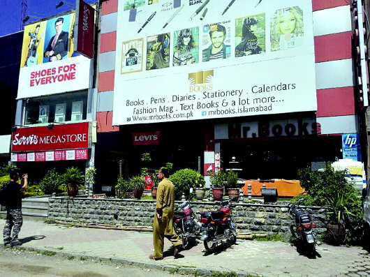 22日在伊斯兰堡市的商业街上,一位市民从书店前走过。