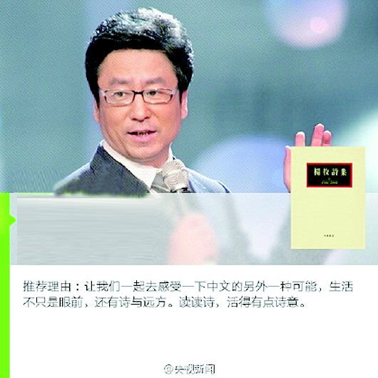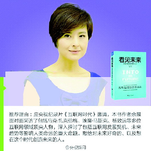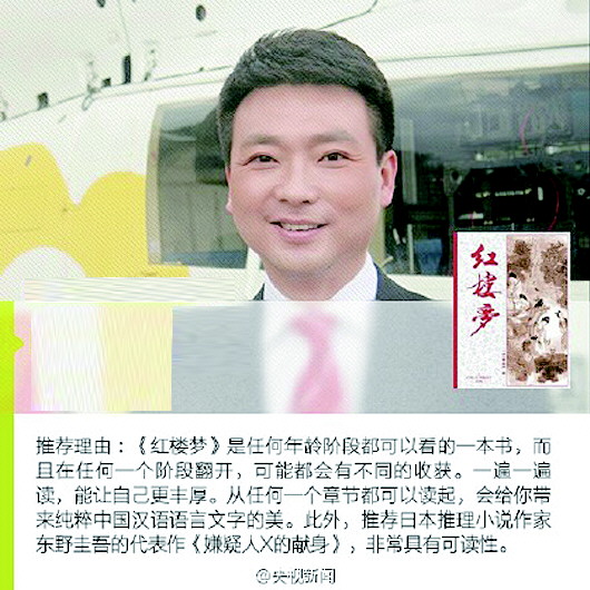 22日,央视著名主持人集体向读者荐书。知性主持人敬一丹推荐《微读节气》,希望读者从节气中感受文化;白岩松推荐《杨牧诗集》,希望读者们感受到中文的另外一种可能;主持人张泉灵推荐《看见未来》,与读者分享互联网时代的重大命题;康辉推荐《红楼梦》,希望读者感受纯粹汉语的美;欧阳夏丹推荐《谢谢你离开我》,希望读者能感受豁达;主持人董倩推荐《梵高传》,希望读者能喜欢梵高;李梓萌推荐《人生》,希望读者看透人生。