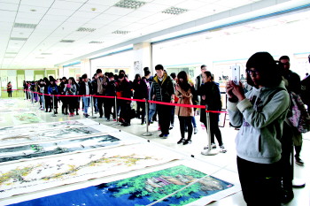 在气势宏大的展厅里,人头躜动,吸引了千余名师生前往观看。这次活动的顺利举行,进一步推动校园文化建设,推进文化艺术教育的开展,提升广大师生的文化艺术素养。据介绍,齐鲁书画研究院是经省体改委批准,1987年3月28日成立的第一个省级画院。研究院成立以来,始终坚持把歌颂祖国的大好河山、淳朴民风、风土人情、优秀美德,反应人民群众美好生活作为永恒的创作主题,先后结合亚运会、奥运会、希望工程、赈灾等主题为社会奉献书画作品上万件。如今齐鲁书画研究院先后在济南、青岛、烟台、潍坊、临沂、菏泽、济宁、泰安等多个地市建立分院,成员多达5000余人。