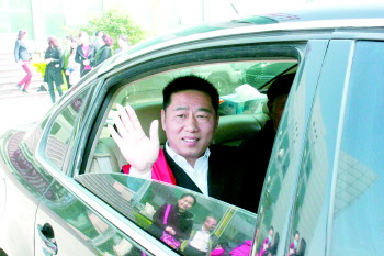 王传祥在车中挥手告别。本报记者 岳茵茵 摄