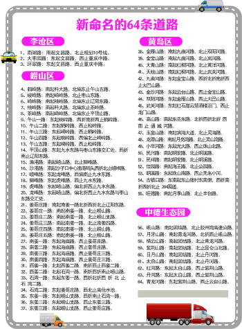 64条命名的新建道路包括李沧区3条,分别为雨湖路(南起文昌路,北止规划10号线),大枣园路(东起文昌路,西止重庆中路)和环翠路(东起文昌路,西止重庆中路);崂山区34条,黄岛区18条,中德生态园9条。6条更名道路为平定路更名为新荣路,株州路更名为株洲路,海洲路更名为海川路,崂山路原南姜哥庄至九水东路段更名为崂山支路,珠山支路更名为珠山北路,芙蓉路更名为黄洋河路。3条注销道路为黄岛区西港路、珠山中路、文化东路。另有崂山区科大路、科大支路,黄岛区同江路、海港路、两河路、云海路、金贵路、金源路、珠山北路、明月路、悬泉路等11条道路调整起止点。