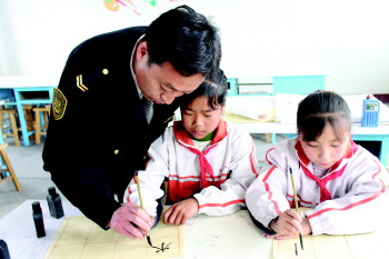 21日,胶州市44岁的校车司机杨卫东正在给胶州市杜村镇大村小学的孩子们上书法课。杨卫东擅长软笔楷书和行书,经常把自己的作品贴在校车上给孩子们看。这位校车司机的书法作品深受孩子们欢迎,最终学校支持他专门开设书法课。