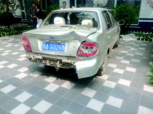 在智远派出所的院子里,记者见到了肇事的夏利车,前挡风玻璃左侧有一条十几厘米的裂口,右侧车门玻璃已破碎。一个马扎还躺在左侧座位上,汽车的后车灯和后备箱的位置已经完全扭曲变形,保险杠断落。