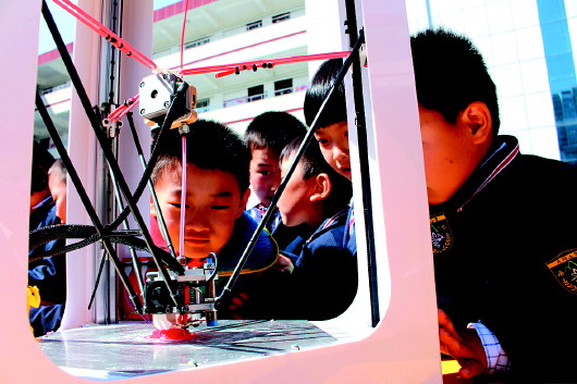 近日,济南市燕柳小学举行第七届校园科技节,3D打印成最大亮点。图为学生们围观正在工作的“3D打印机”。 本报记者 李飞 实习生 孙娜 摄