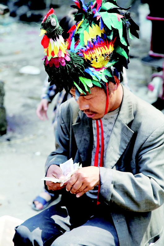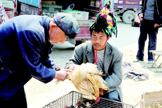“妈妈,叔叔戴的公鸡好漂亮。”一个六七岁的男孩被中年男子头上的公鸡吸引,停下脚步。“多少钱一只,给我拿五只吧。”此时,一位头发花白的老人拿过塑料袋,抓起了几只小鸡。