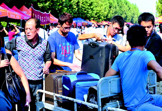 大学新生报到,家长和学生忙着运送行李。(资料片)本报记者 邱志强 摄