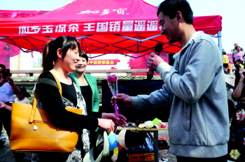 26日上午,相亲会主持人在现场发起了“猜数字”游戏,邀请多位单身男女一起参与游戏、增加了解,李女士和毕先生同时参与了这次游戏。主持人悄悄告诉李女士一组数字,李女士则不能说话,只能通过眼睛和嘴巴,将这组数字传递给三位男士,让他们来猜数字。而与她很有默契的毕先生最终猜对了这组数字,赢得周围市民一阵掌声。