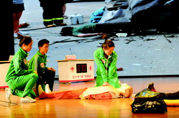 26日,应急救护志愿者正在进行模拟救护比赛。为迎接第68个“5.8”世界红十字日、第7个“5.12”全国防灾减灾日,淄博市红十字协会举办“职防院杯”淄博市大学生应急救护技能电视大赛,比赛分理论知识和应急救助技能操作两个环节,7所驻淄高校大学生的7支应急救护志愿队参赛。