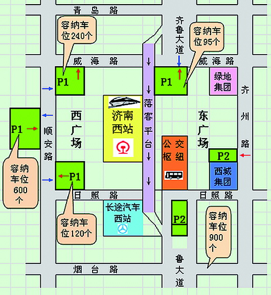 目前,西站附近停车场主要有西客站地下停车场,有1800个地下停车位,进口分别在齐鲁大道烟台路向北100米处和齐鲁大道平台上口南50米处。此外,西客站西广场附近也有三个地面停车场,可以提供960多个停车位。