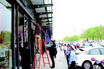 执法人员沿东岳大街、青年路、财源大街、校场街等路段巡查,对相关商铺逐个进行检查。10点左右,巡查到财源大街中段时,多个商家正在进行促销,该段噪音最为严重,店铺门口都悬挂或摆放着音箱,播放音乐或促销信息。一服装专卖店门前摆放了两个大型音箱,所播放的音乐声隔着百米远就能清楚听见。
