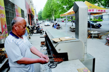 29日,市高新区一名烧烤店主正在使用无烟烧烤炉。今年淄博市通过财政补贴,在烧烤业户中推广无烟炉具,目前已在中心城区试点。无烟炉具可净化90%的油烟,可有效解决露天烧烤产生的大气污染。
