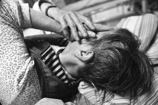 受伤老太在急诊室等待检查结果,她的头部渗着血鼓起大包。 本报记者 王媛 摄