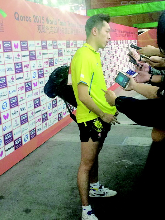 许昕接受采访时疲惫不堪。