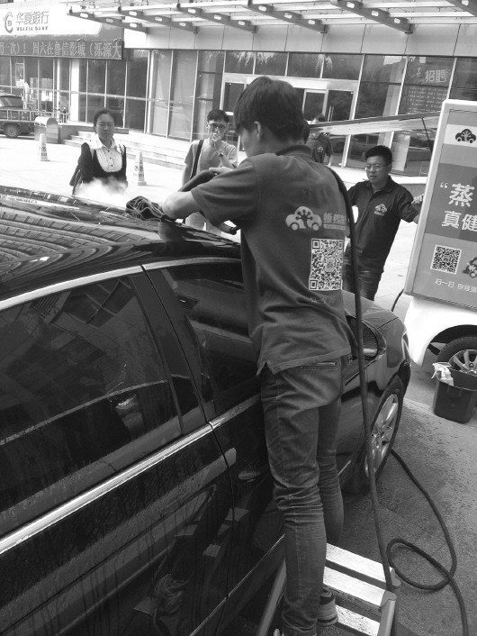 4月30日,记者看到,整个外洗的时间是11分钟左右。而打蜡这样的汽车美容服务则大约花20到30分钟。现场不时有好奇的上班族围上来观看洗车过程,“和到洗车行不一样,感觉挺新颖。”在银荷大厦上班的方先生说。