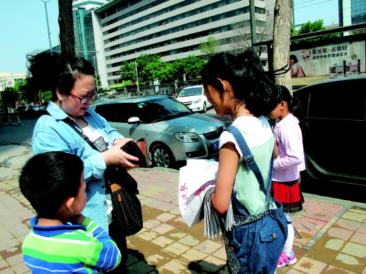 小朋友们义卖报纸过程中,一位爱心市民慷慨解囊。 本报记者 肖龙凤 摄