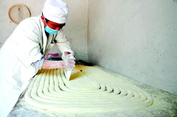 在山东聊城斗虎屯镇北夏村,手工挂面传人夏新山和杨敬萍正在制作手工空心挂面。空心面最早起源于明朝洪武年间,距今有数百年的历史,由山西洪洞县传入山东聊城,逐渐演变成为“龙头凤尾”面,因其细如发丝,又称“银丝面”。