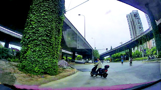张某的车在正常行驶中。14时13分30秒时,张某车辆突然从辅道第三车道偏离至非机动车道(辅道最右侧)。而在同一时间,卢女士车辆则在张某车辆左侧出现并行驶在从右往左第二主道。