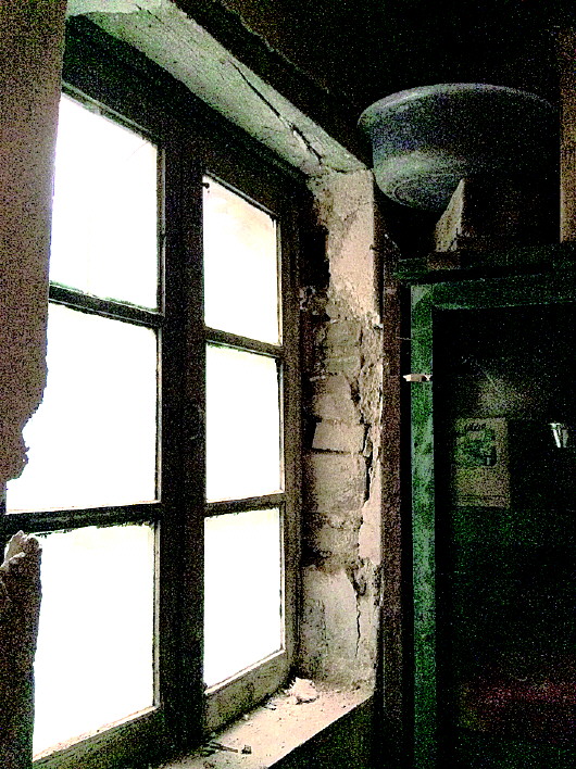 ◤双忠祠街孙家公馆西屋一处窗户内墙脱落。