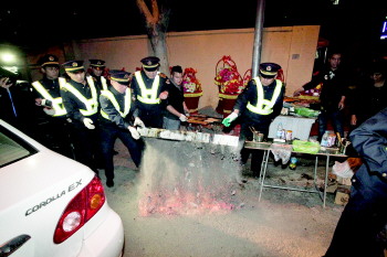 5日晚6点至12点,李沧城管联合公安对露天烧烤展开集中整治,40余名执法人员对金水路、大崂路、巨峰路、京口路等路段进行了巡查。当晚7点半,在升平路上,一家全羊馆的门外正有两名员工忙着烧烤,见到执法人员,两名员工抬起仍在冒烟的烧烤炉就往店内跑,被执法人员拦下后,一名员工仍不忘从炉子上抢下几串烤肉,执法人员暂扣了现场的烧烤用具,对这两名员工及饭店老板进行了警告,责令其不得再次违法经营。当晚8点10分,在金水路中段,执法人员查处了一家露天野烧烤,就在执法人员暂扣烧烤炉时,摊主似乎并不关心被扣的烧烤炉,而是往旁边一处灌木绿化带中张望,现场执法人员立即搜查了绿化带,从中发现了两个崭新的烧烤炉。“这是摊主留在绿化带里的备用炉,想等我们走后再摆出来。”现场执法人员将这两个烧烤炉也一并暂扣,责令摊主立即收摊。