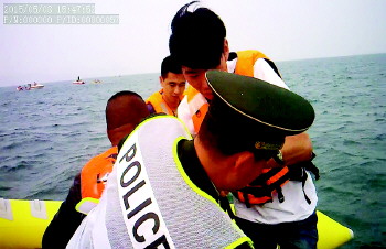 接警后,正在景区巡逻的薛家岛边防派出所民警立即联系了救援快艇向报警人所说的位置驶去。虽然海上风很大,但是能见度较高,民警很快在金沙滩景区游乐场西南处距离岸边2000多米的地方望见了报警的求助者。此时,受到大风影响,橡皮艇还在向远处漂。民警立即向橡皮艇方向驶去,看到民警靠近,橡皮艇上的游客纷纷挥手大声呼救。追上橡皮艇后,5名游客被转移到快艇上,安全驶回岸边。