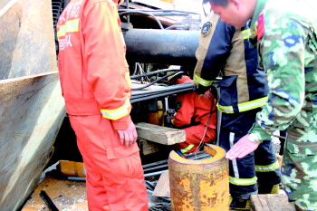 救援人员到达事故现场后,看到一辆巨大的吊车已经完全侧翻横亘在路边,吊车驾驶室的玻璃全部破碎,吊车机油迸溅得到处都是,一名操作人员被困在严重变形的驾驶室中,其右脚被粗大的吊车顶杆牢牢卡住,无法动弹,双腿浮肿并已失去知觉。