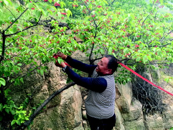 在横穿过石头堆积的河床后,记者随王旭梅夫妻上山,在樱桃树、杏树栽种区,南面朝阳的部分樱桃已明显泛红,入口甜中带酸,十分爽口。“樱桃这个周末就陆续熟了,如果有好心的市民来北宅摘樱桃时能选我们家,我们万分感激。”王旭梅说。