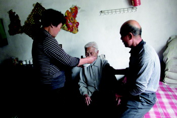 路桂香和陈廷俊一起照顾老人。 本报记者 唐菁 摄