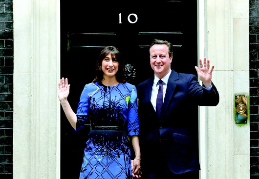 5月8日,卡梅伦(右)与夫人萨曼莎回到唐宁街10号首相府时向人们致意。新华/路透
