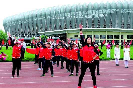 8日,济南市东方双语实验学校和纬二路小学同时举行了春季田径运动会,他们不约而同地选择了“借地方”。图为济南市东方双语实验学校在奥体中心田径训练场举行运动会开幕式。 本报记者 李飞 摄
