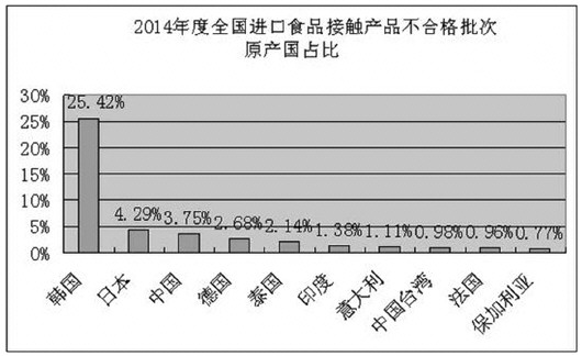 2014年,我国进口食品达到104.2万批次,其中检出问题食品3503批次共2.4万吨。不合格食品中,来自欧盟、中国台湾、东盟、美国、韩国、日本等数量最多。相比欧盟食品,台湾食品问题更为突出,虽然进口数量不在前十位,但在不合格进口食品中却排在第二位。不合格进口食品种类中,糕点饼干、饮料、粮谷及制品类、糖类和乳制品分别排前五位。
