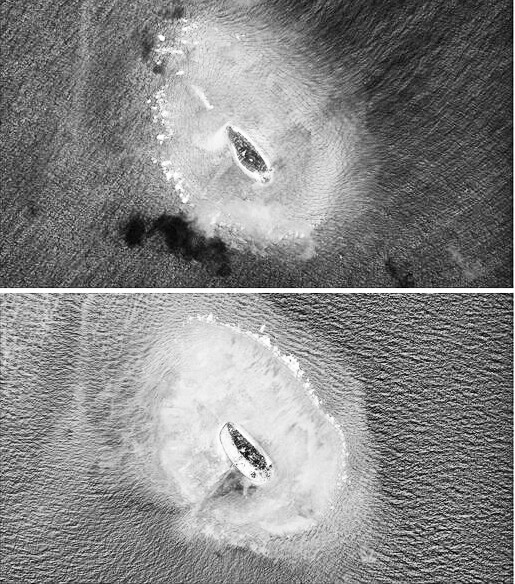 相比2011年(上图),2015年拍摄的越南占据敦谦沙洲,填海造地面积为2.1万平方米,岛礁面积几乎扩大一倍。