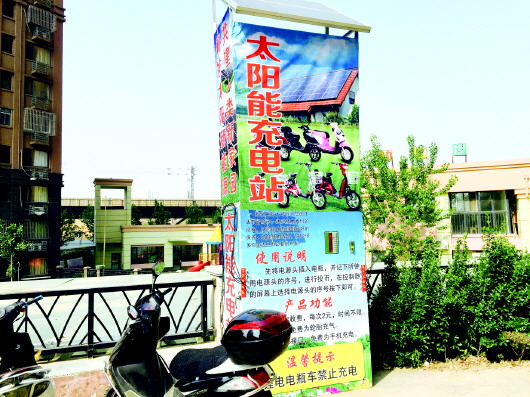 在楼下,王女士看到住在对门的邻居正在广场上,身旁的电动车就放置在一个新增加的设备旁边。走近之后,王女士发现这个设备被称为太阳能充电站。在邻居介绍之后,王女士得知,这个设备可以为电动车充电,只要投币两元钱,就可以将电池充满。当时,邻居家的电动车就连接了其中一根线正在充电。