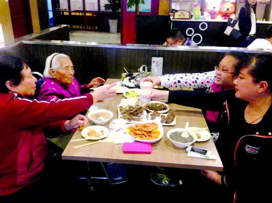 谷经理介绍:“今天的订餐多是家宴,商务宴比较少。”在和平路一家餐厅,经理邢女士介绍,除了包间订满后,大厅的散座也有一半被预订。“吃饭人数太多,大厅还出现了拼桌。”邢经理介绍,前来就餐的多是一家子人,“母亲岁数大多在六七十岁。”