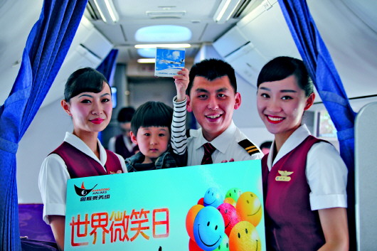 2015年5月8日,世界微笑日,山航“鲁雁”乘务组在2014年“微笑中国”大赛“精英天使”获得者郑轶乘务长的带领下,开展了“与微笑同行”机上活动,与旅客开展互动,将微笑带进客舱,传播微笑之美,营造欢乐之旅。