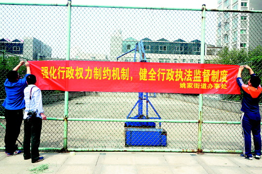 《山东省行政执法监督条例》将于5月1日起正式施行。4月27日至5月1日,省政府法制办在全省范围内组织开展《条例》宣传周活动。近日,姚家办事处和三箭平安苑居委会工作人员在文博家园小区悬挂宣传横幅,向居民宣传《条例》相关规定。 通讯员 袁铭 摄