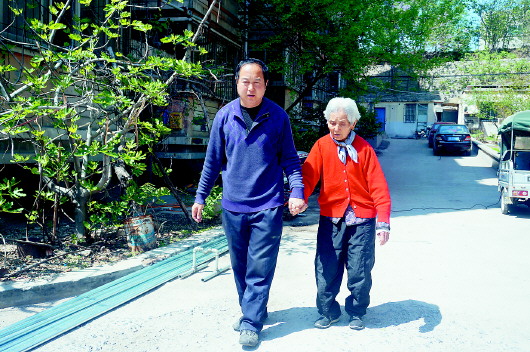 在友谊苑小区南区,每天都有一个温馨的情景,一位儿子拉着妈妈的手遛弯。比起头发花白、瘦瘦小小的母亲,儿子显得那么高大有力,稳稳地牵着母亲一路走去。这就是家住友谊苑社区、年过半百的房泽民,和他的84岁的母亲艾宪菊。